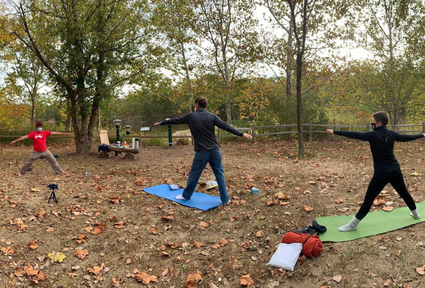 Three people practice a yoga pose, spread out around a clearing covered in fallen autumn leaves. Photo courtesy of Indy Community Yoga.
